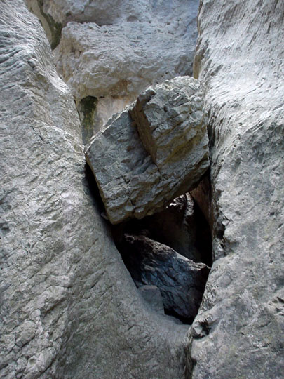 Una vez que entramos en la parte alta del cañón, tenemos unos cuantos metros de progresión, con diversos destrepes que, a priori, no presentan una gran dificultad. Por esta zona se encuentra, en pleno cauce, la boca de entrada, de pequeñas dimensiones, de la Cueva de Donini (travesía), magnífico recorrido cuya surgencia, en una cascada de 55 metros, veremos desde la última dificultad del descenso, en un entorno único. Señalar que no localizamos su boca, al estar posiblemente más arriba del punto en el que le entramos al descenso. Para planificar la Cueva de Donini recomendamos utilizar [CONC-02]. Sí nos encontramos otra boca de cueva que, presumiblemente, según nos informaron, se acaba por sifonar. Creemos que es la que se muestra en la siguiente fotografía.